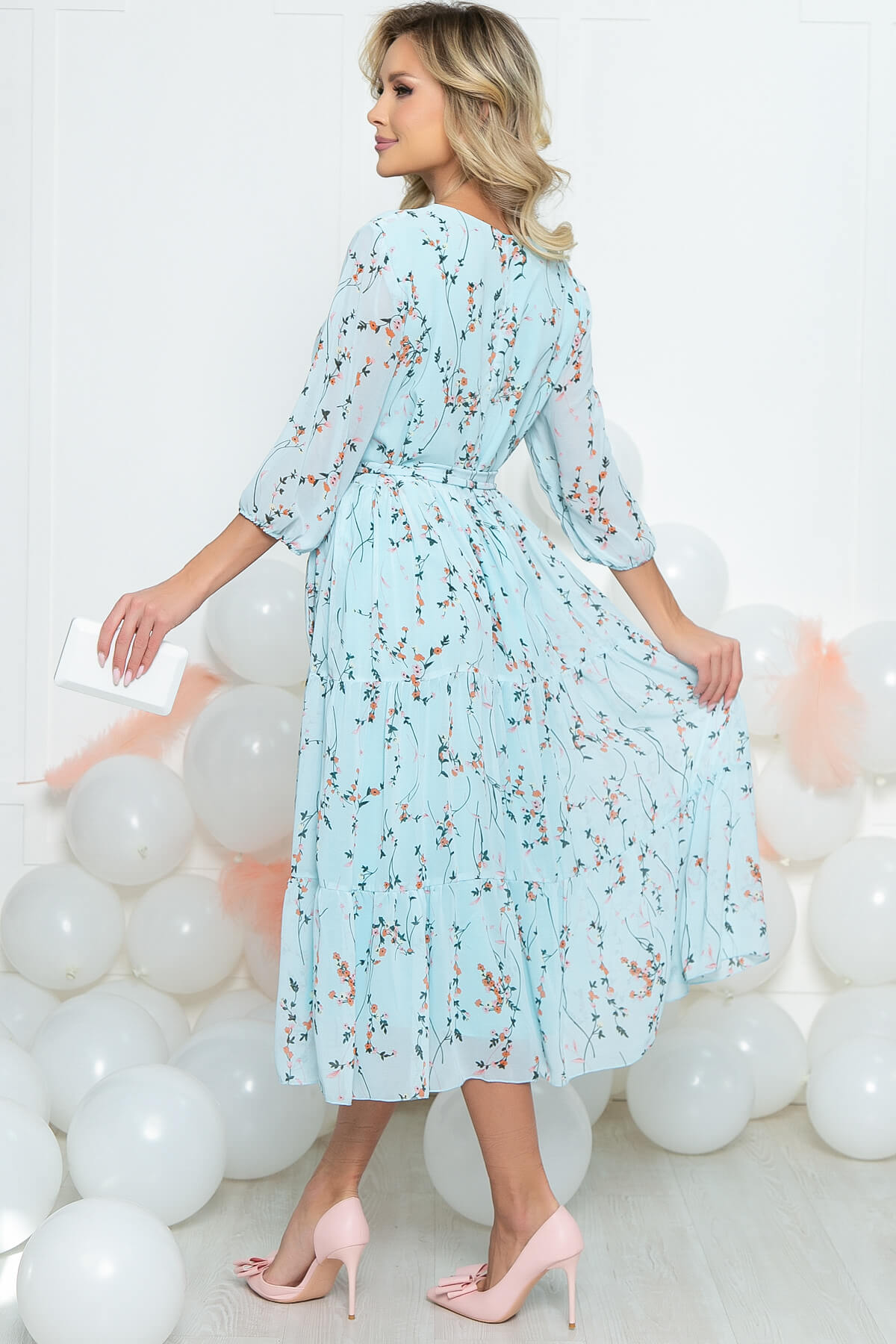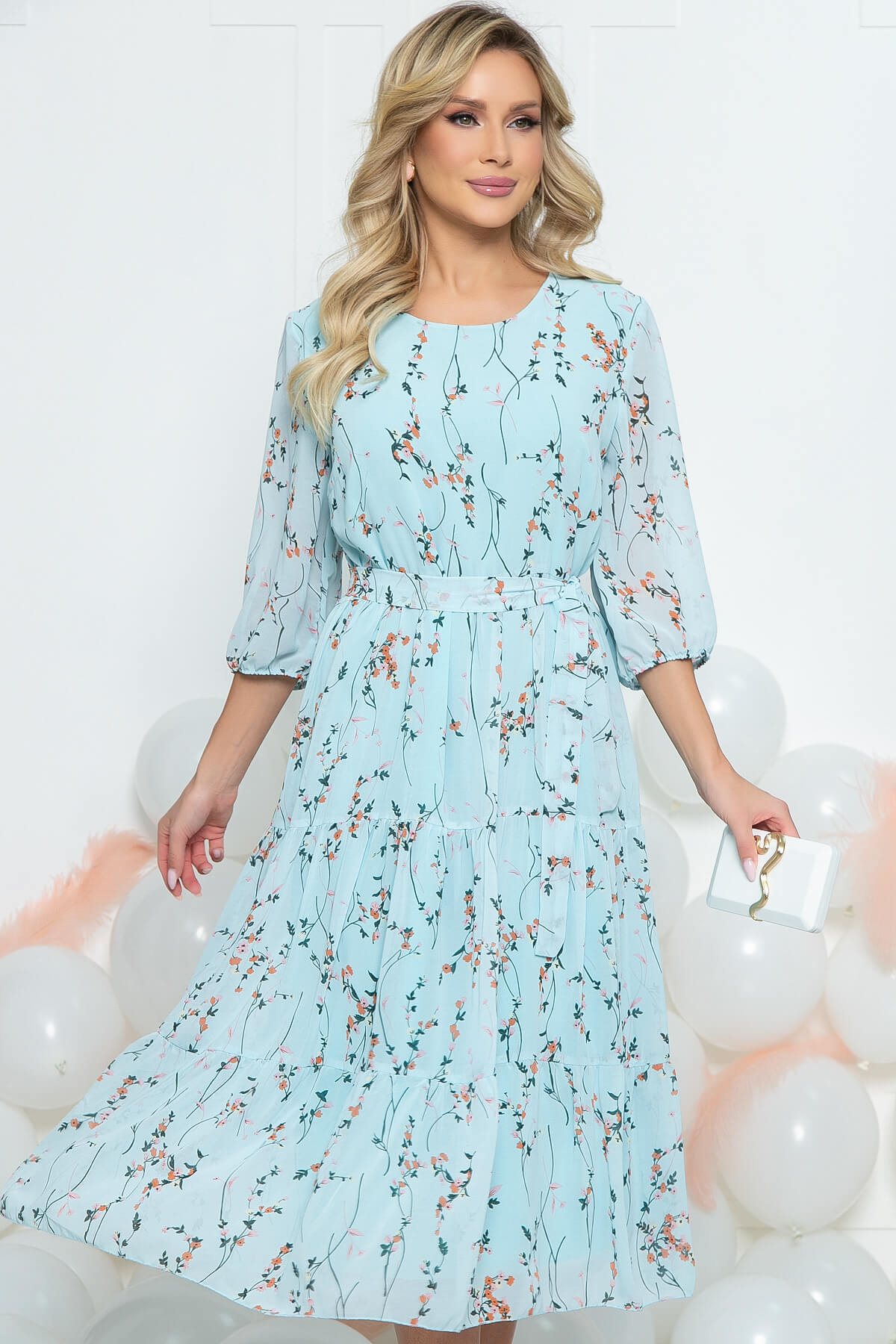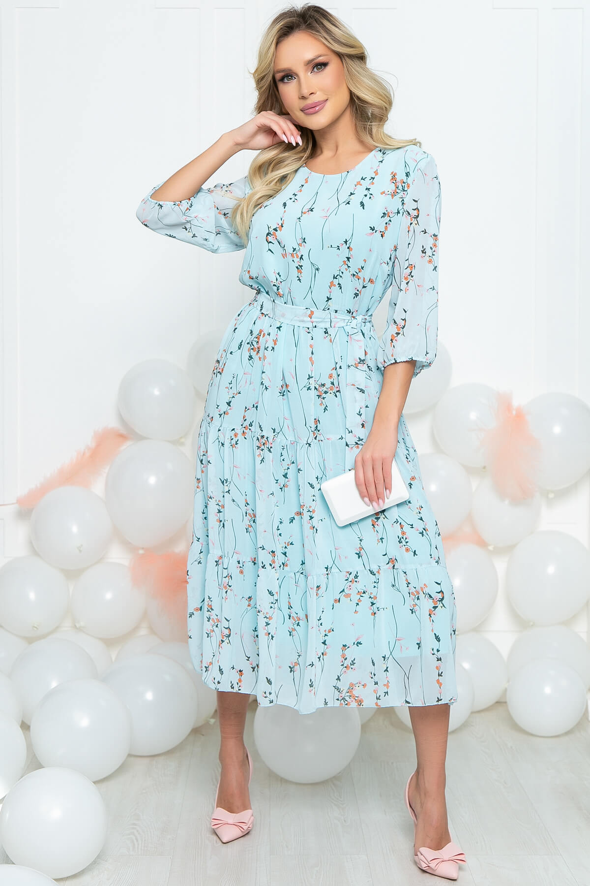 Платье из шифона с цветочным принтом украсит ваш нарядный образ и создаст прекрасное настроение. Голубой цвет платья добавит привлекательности. Нежная и струящаяся фактура ткани выгодно подчеркнут достоинства фигуры, а пояс из основной ткани сделает акцент на талии.