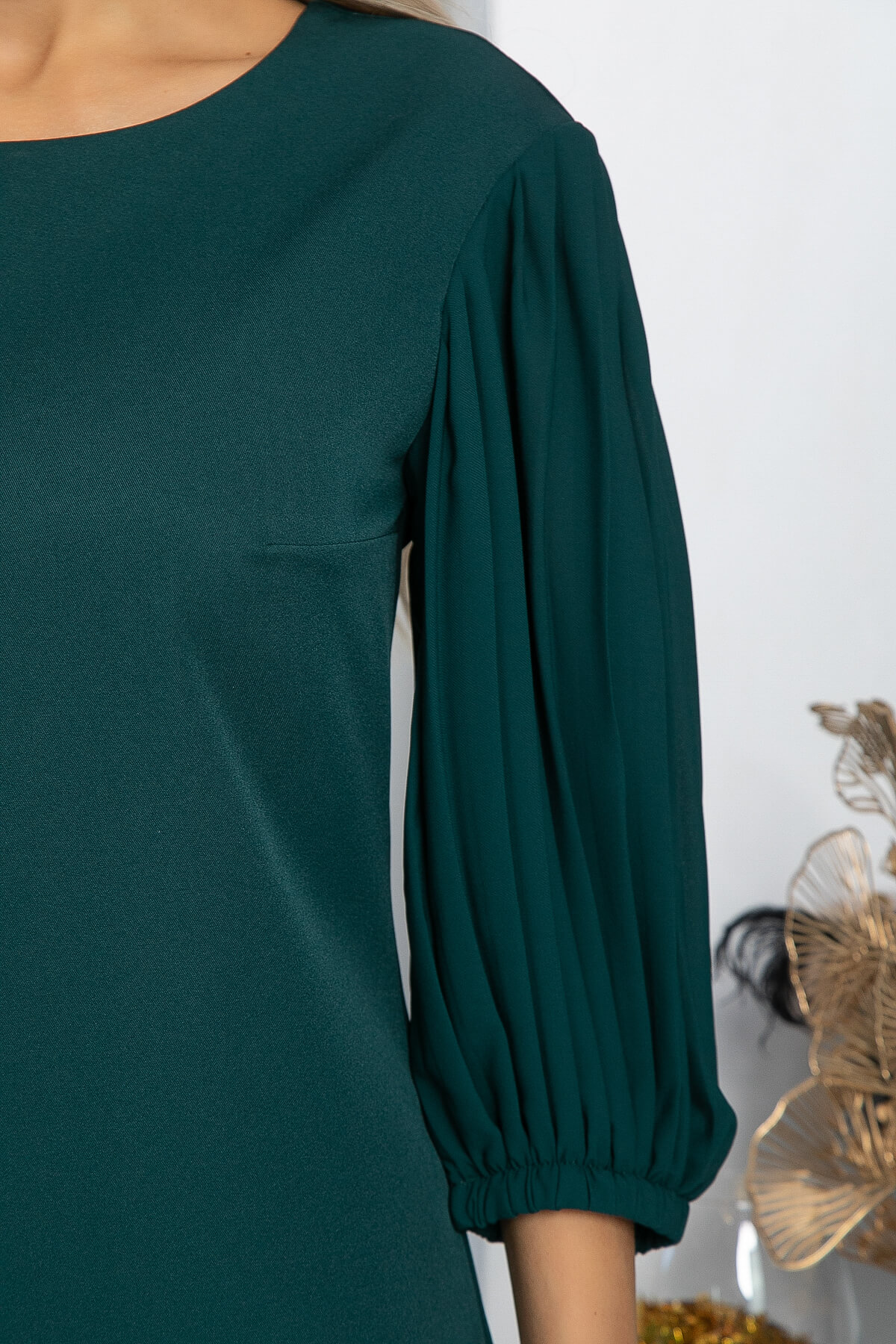 Элегантное платье полуприлегающего силуэта отлично подойдет для того, чтобы сходить на мероприятие или посетить ресторан, а так же можно смело надевать в офис или носить каждый день. По переду нагрудная выточка. Для того чтобы не сковывать движения при ходьбе по низу платья выполнена шлица. Округлая горловина, плечо чуть спущенное. Рукава выполнены из шифона гофре, который является акцентной деталью этого платья.