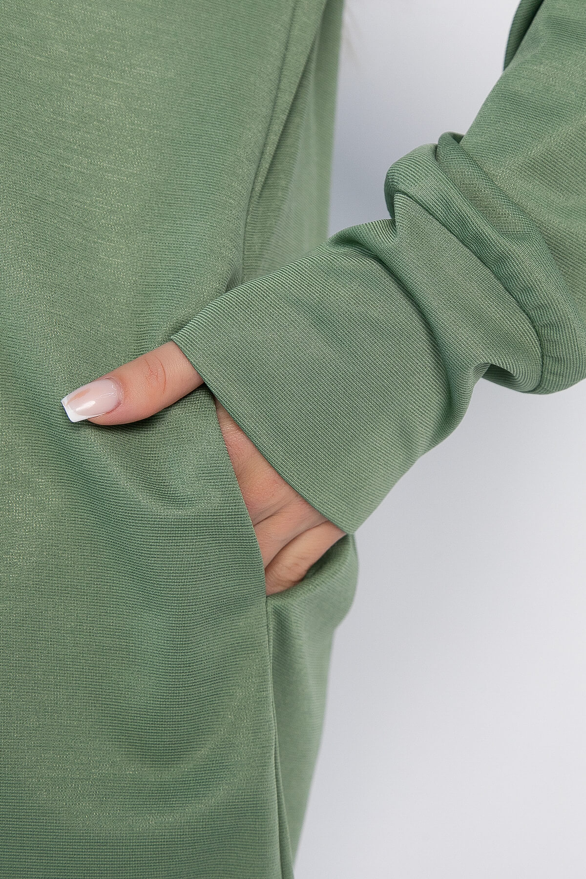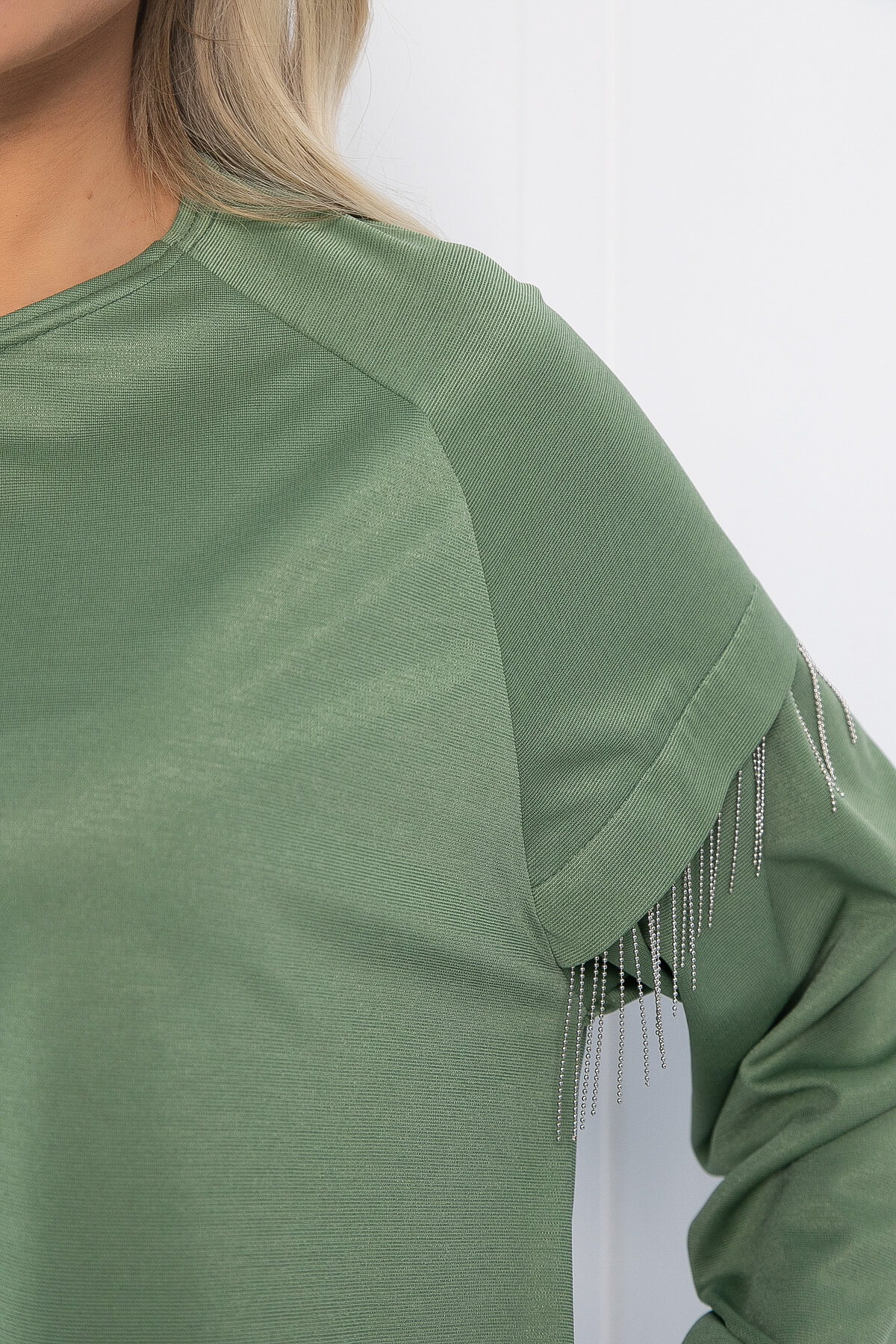 Трикотажное платье свободного кроя в оливковом оттенке — это отличный выбор для создания стильного и комфортного образа! Его отличительной чертой является эффектная металлическая бахрома, которая придаёт ему оригинальности. Модель оснащена удобными боковыми карманами. Элегантные рукава с высокой манжетой не только добавляют образу изысканности, но и защищают от холода.